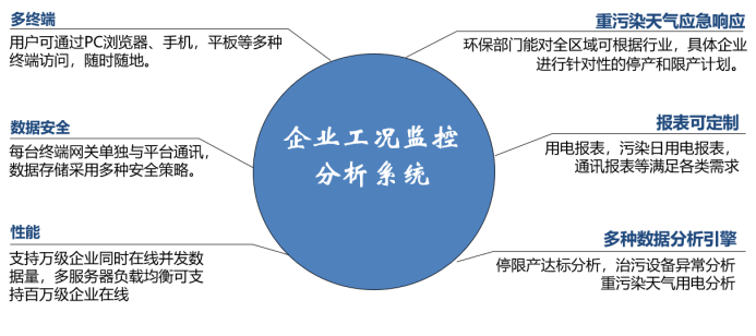 依托創(chuàng)新的物聯(lián)網(wǎng)電力傳感技術(shù),實時采集企業(yè)總用電、生產(chǎn)設(shè)備及環(huán)保治理設(shè)備用電數(shù)據(jù),通過關(guān)聯(lián)分析、超限分析、停電分析、停限產(chǎn)分析,及時發(fā)現(xiàn)環(huán)保治理設(shè)備未開啟、異常關(guān)閉及減速、空轉(zhuǎn)、降頻等異常情況,系統(tǒng)支持PC、手機、平板電腦等多種終端訪問。